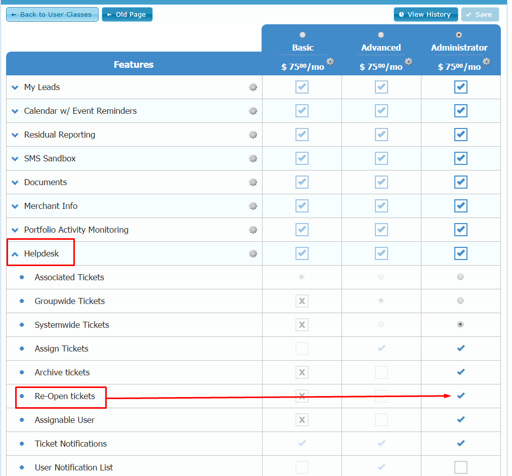 To enable this permission navigate to Manage > Administration > User Classes > Permissions > Helpdesk > Re-Open tickets