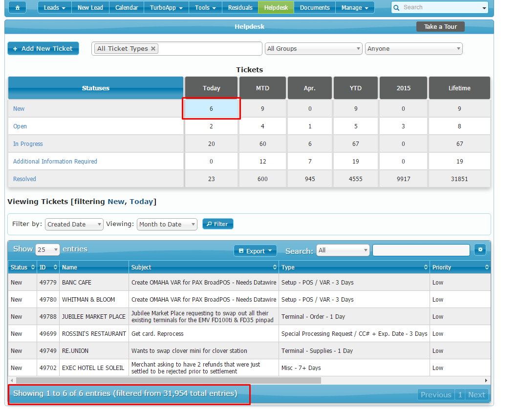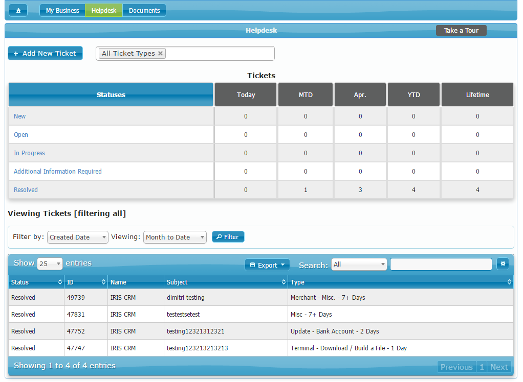 Once you enable Helpdesk access for the Merchant user class, the merchant users can begin submitting tickets. Here is what Merchants see when they log in.