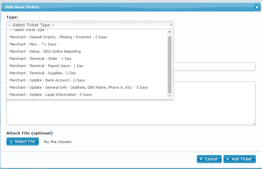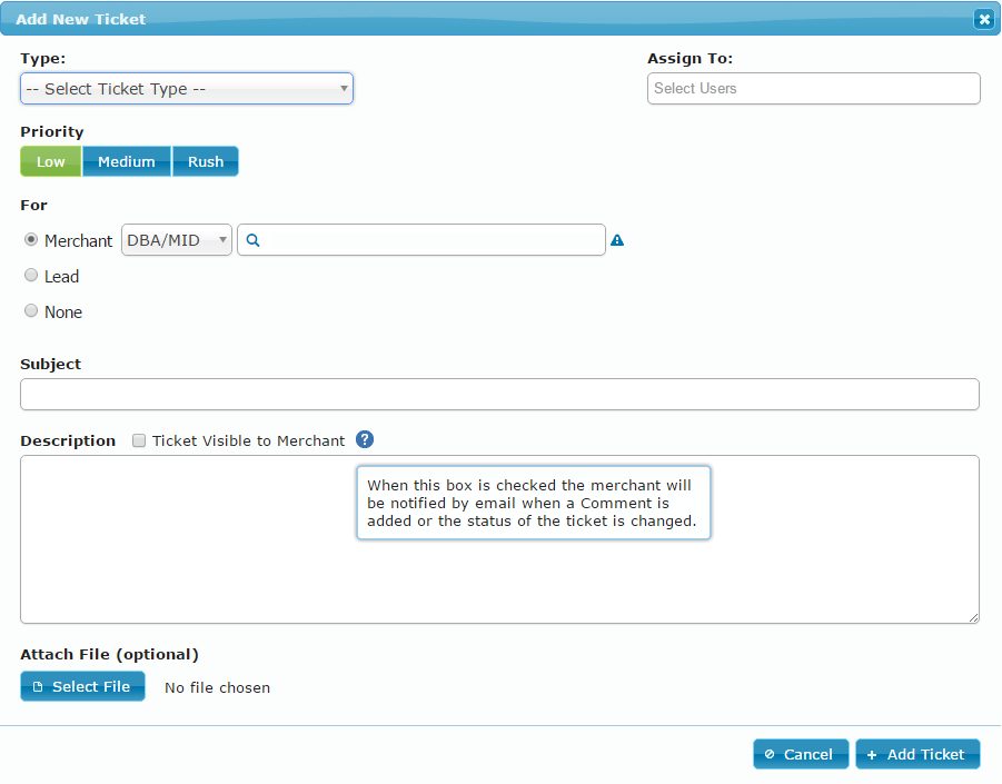 Tickets can also be made visible to merchants on a ticket by ticket basis. When creating a ticket, you will see a new check box next in the Description section that toggles visibility called "Ticket Visible to Merchant". By checking this box, merchants will notified by email when a ticket is created, changes status or a comment is added:
