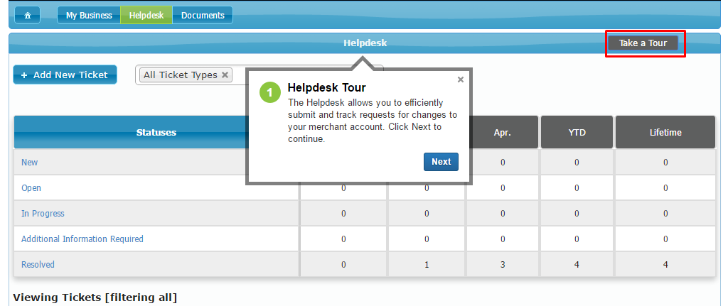 Merchants and your staff can learn about the new Helpdesk by pressing the Take a Tour button at the top of the page.