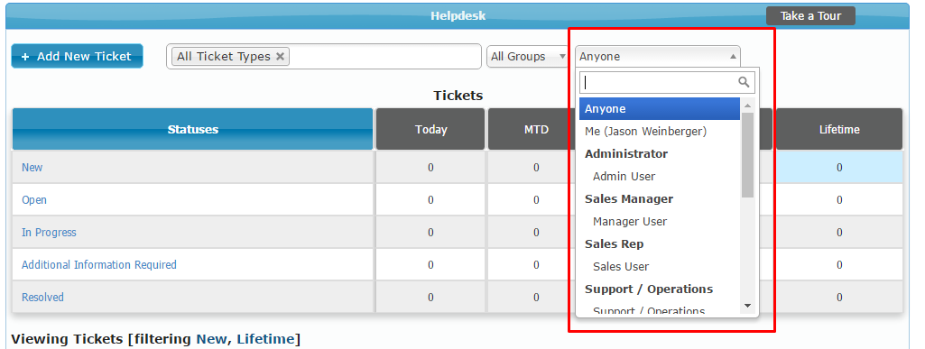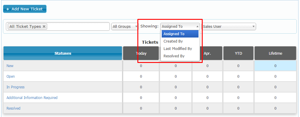 If you would like to see all tickets that were created, modified or resolved by a specific user, we made this possible through a user-selection dropdown:
