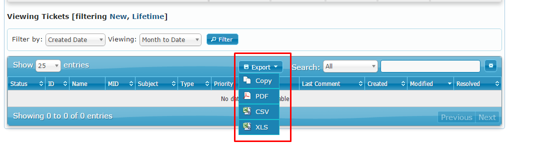 You are now able to export Helpdesk ticket data! Click the "Export" button and select the appropriate file type to receive a filtered ticket report: