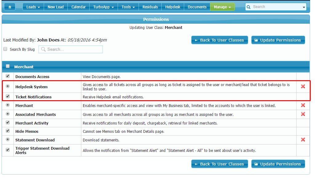 You will now see two new permissions that will enable access to the Helpdesk for your merchants. Select the "Helpdesk System" radio button to turn on the Helpdesk for merchants and check the "Ticket Notifications" box if you want merchants to receive email notifications with ticket updates for tickets that merchants have access to. You have to specify which ticket types merchants have access to which we will explain how to setup below so please keep reading.