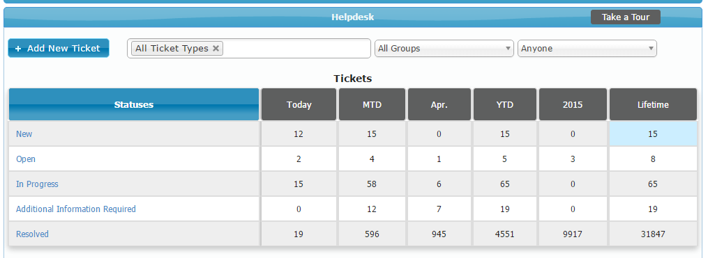 In the gray boxes, you will notice cells that indicate date range filters. When you click on a cell, the tickets that fall under the status and time frame will populate in the table below: