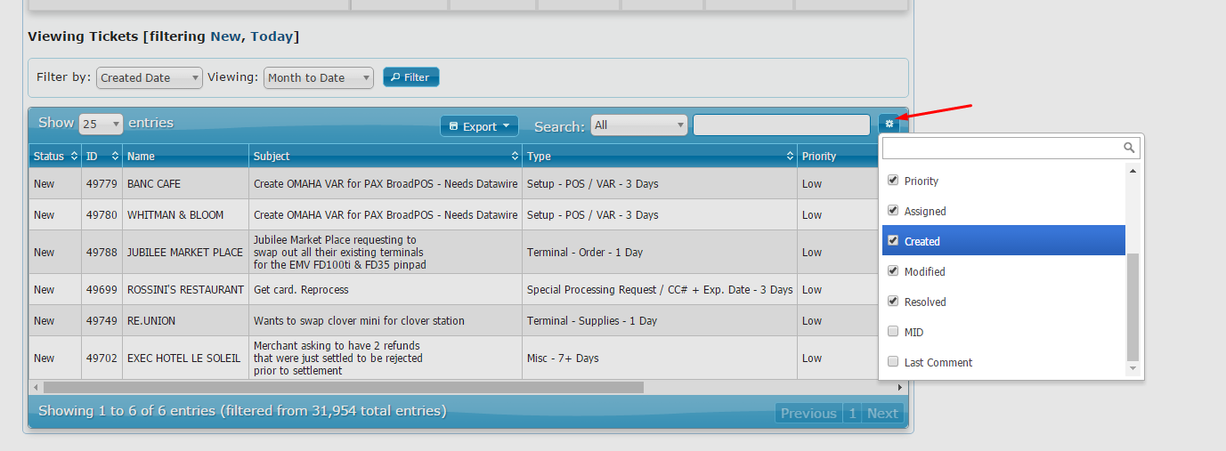 You can further customize your Helpdesk experience on a per user basis by adjusting the visible columns. To toggle the visibility of specific columns, simply click on the cog at the top right of the table and select the columns that you would like to enable: