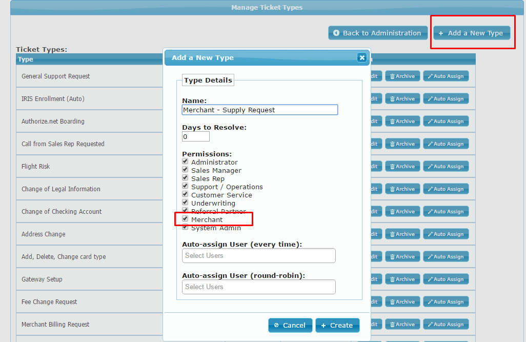 To enable the Merchant user class to submit tickets, navigate to Manage -> Administration -> "Manage Helpdesk Ticket Types".