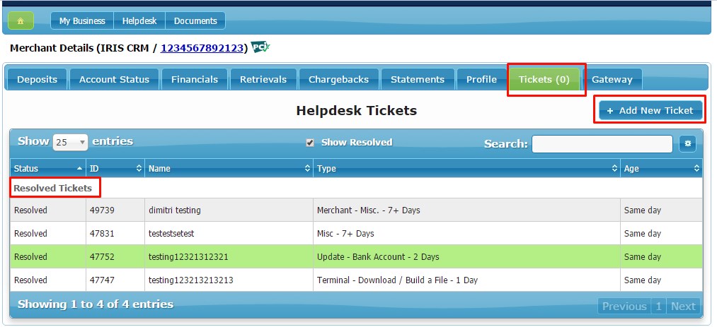 Merchants that click on the new "Tickets" tab in their portal will see an overview of any open and resolved tickets tied to a a particular account. Merchants can add a new ticket directly from the Tickets tab as well: