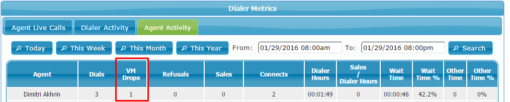 IRIS CRM will also track the amount of voicemail drops per agent on the "Dialer Metrics" page located under the Tools menu.