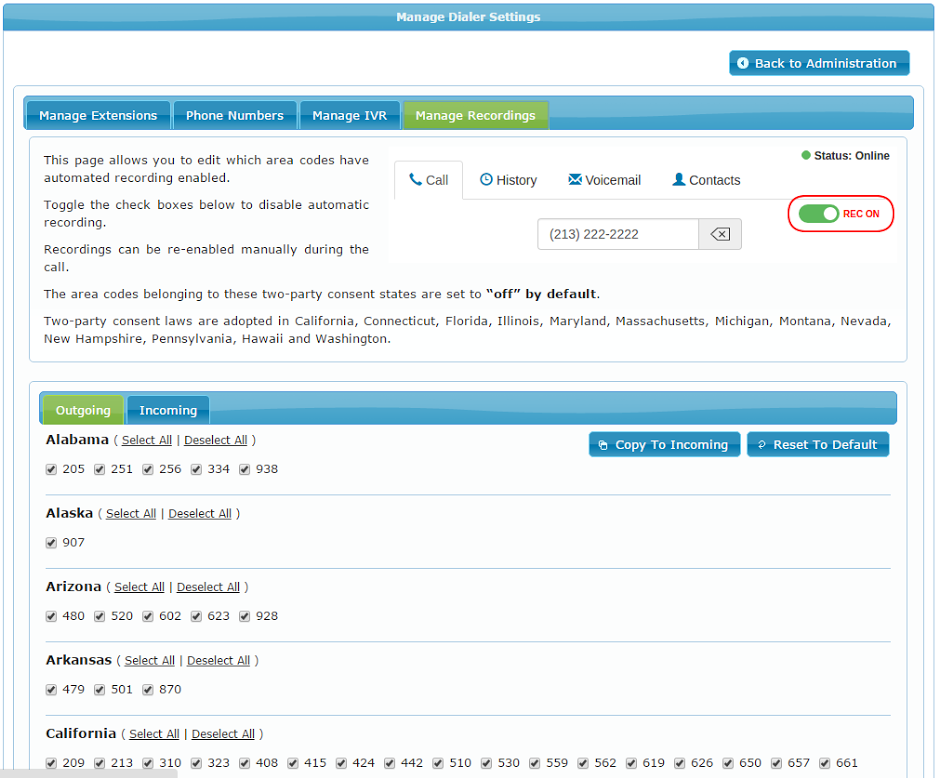 Recording rules can be configured differently for "Outgoing" and Incoming" for the same area code. For example, outgoing call recordings can be turned off for the 11 two-party consent states but incoming call recordings can be set to on because your IVR message says, “this call may be monitored or recorded”.