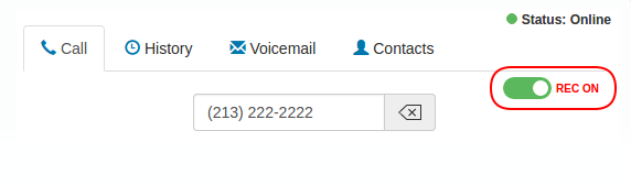 A toggle button appears when calling a disabled area code. Use the toggle to manually turn on recording for that specific call: